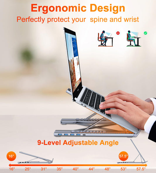 Hub USB-C 5 en 1 avec Support Réglable en Aluminium – 4 Ports USB 3.0 (5 Gbit/s) – Station d’Accueil Pliable pour Ordinateur Portable (MacBook, Dell, HP, Lenovo, etc.) – [Chargement non pris en charge]